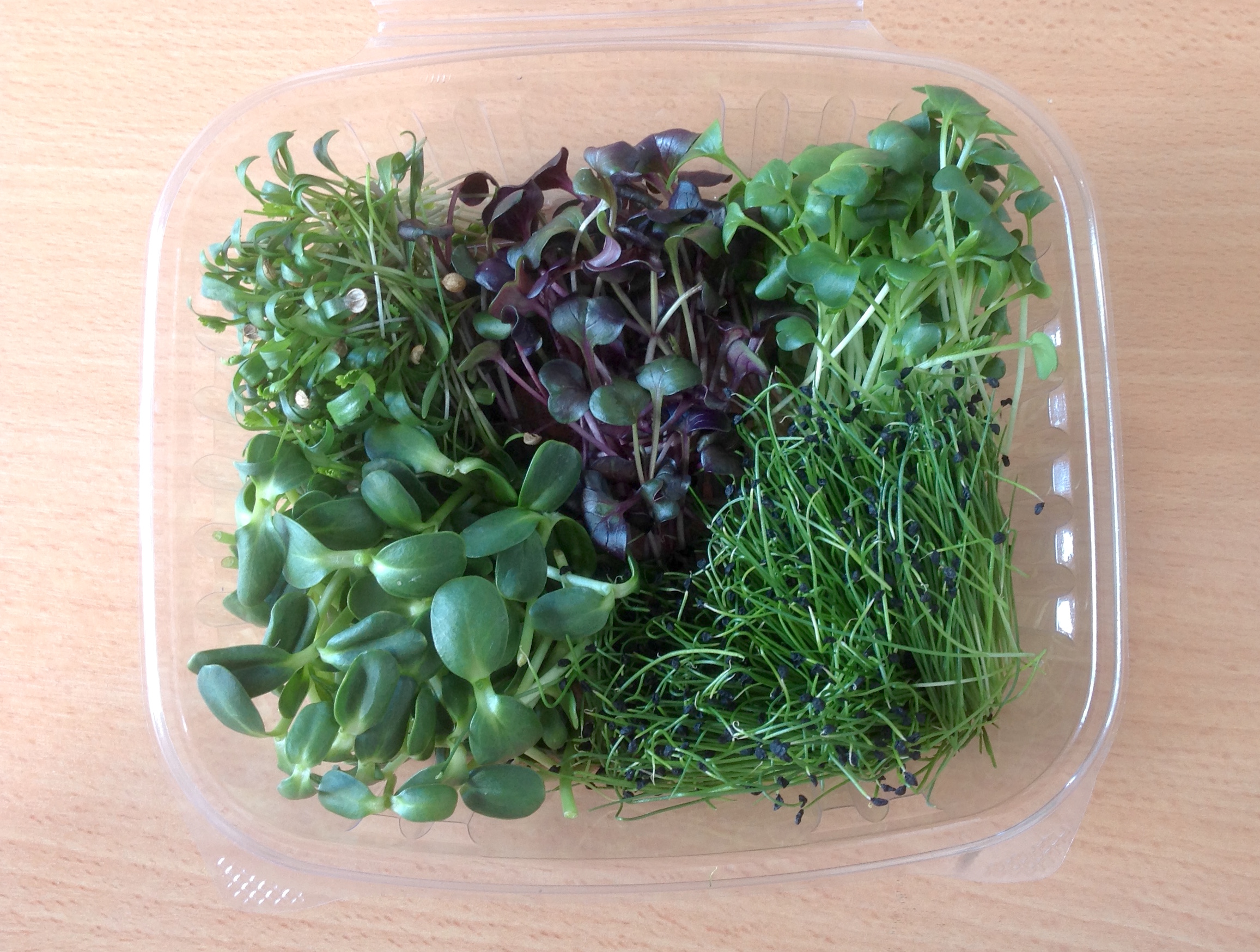 A mix of our greens to bring you a fresh, tasty and colourful salad that is bursting with nutrients and general healthiness and flavour. With a base of juicy and yummy pea shoots and sunflower shoots, each salad will include a mix of our best microgreens available on the day from our range; coriander, red cabbage, broccoli and more. Can be eaten in the raw, drizzled with olive oil and balsamic vinegar, or used as a side salad for your favourite dish.
